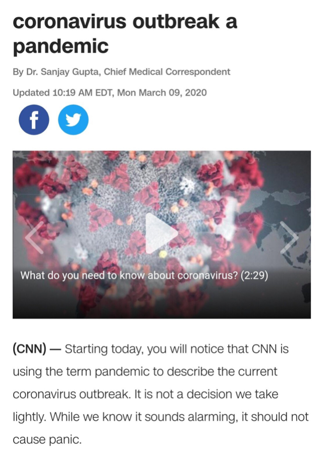 미국에서도 코로나 확진자가 급증하면서 미국의 주요 방송매체인 CNN에서는 지금부터 코로나19를 팬데믹으로 칭한다고 하면서 사태의 심각성과 위기감을 나타냈습니다.