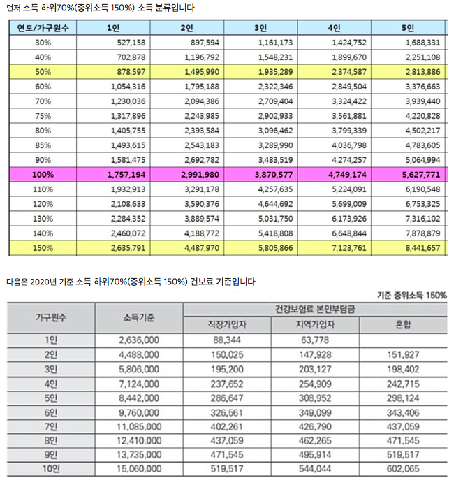 아래 표는 건보료 기준으로 나눈 하위70%(중위소득 150%) 입니다.